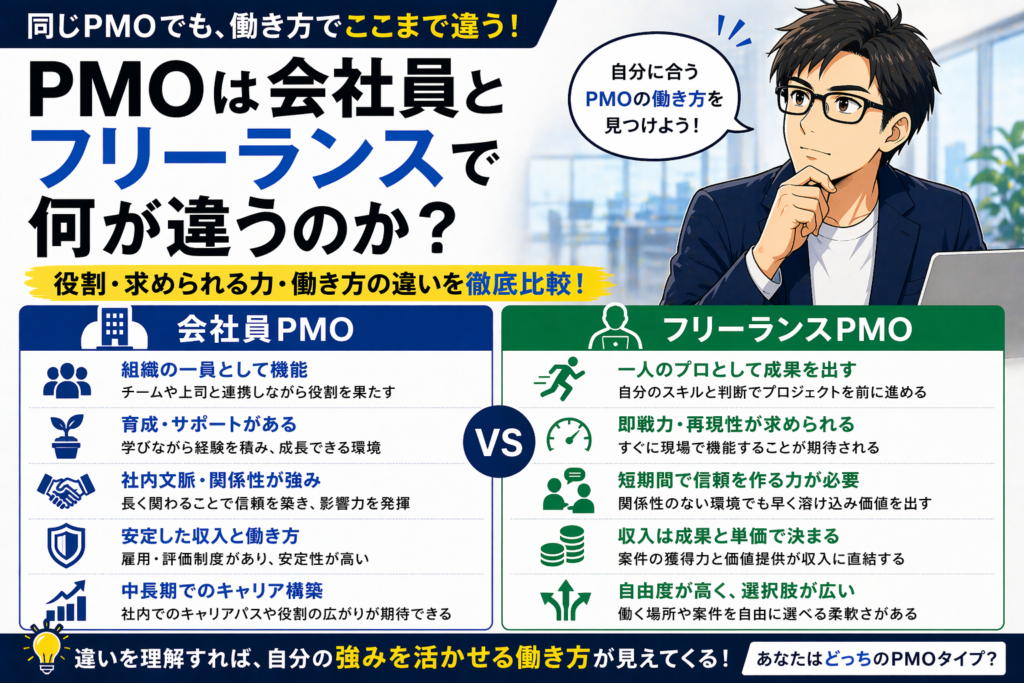 今回は、PMOは会社員とフリーランスで何が違うのかについて書いてみます。
