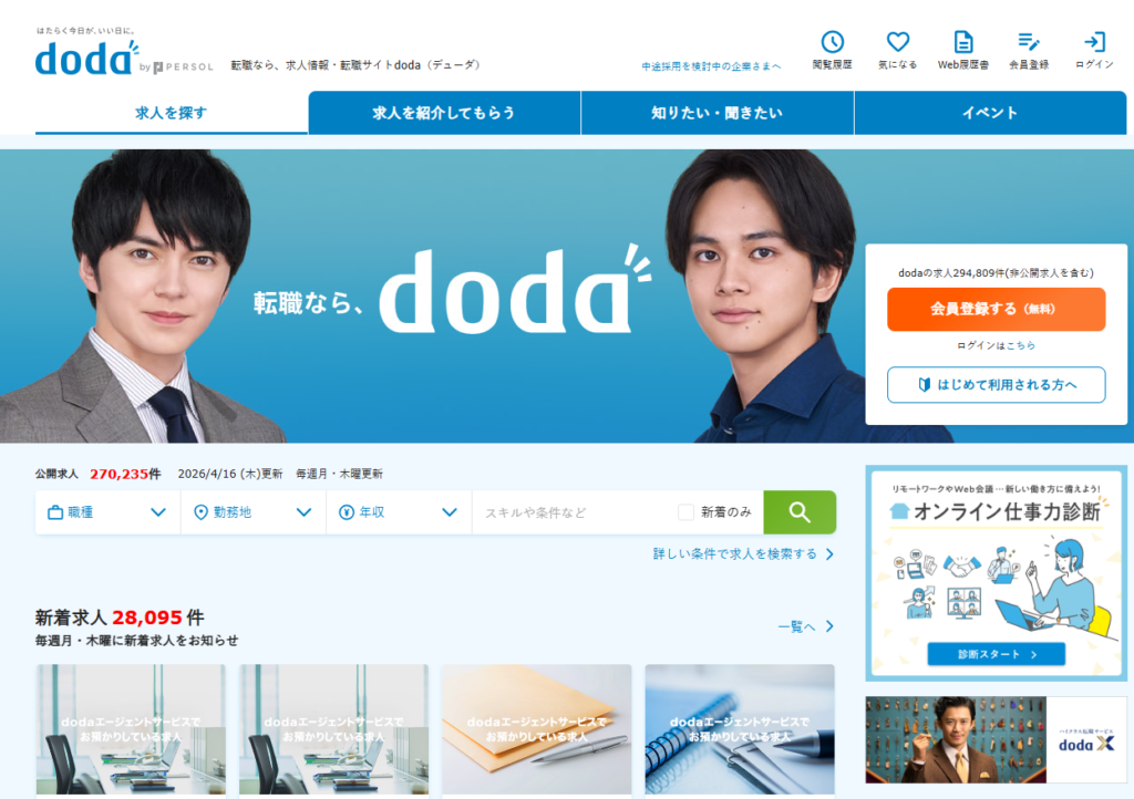 市場全体を広く見たいなら、総合型が有利です。リクルートエージェントはITの公開求人ページに加えて、登録者向けに非公開求人も案内しています。dodaもIT・Webエンジニア領域の求人ページとエージェント支援を展開しています。